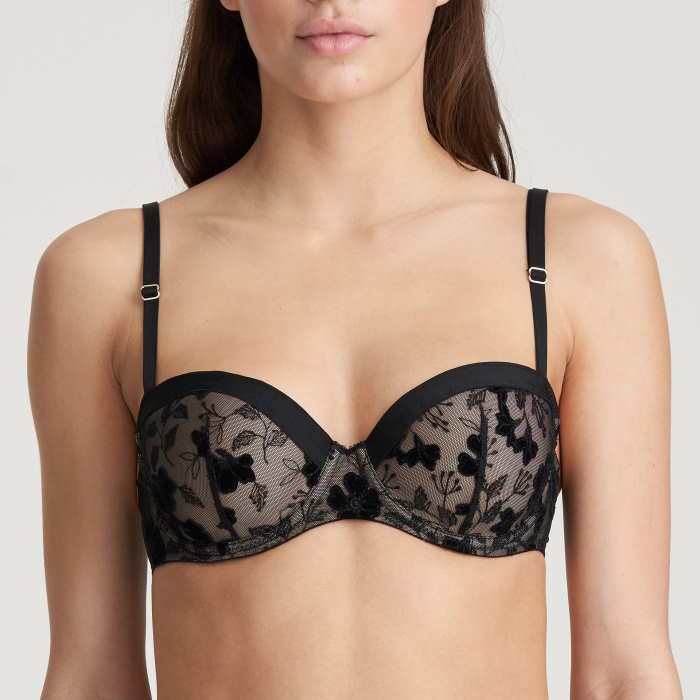 Χαριτωμένο, γιορτινό σουτιέν μπαλκονιού με γεμιστά κύπελλα. Τα γεμιστά κύπελλα είναι διακοσμημένα με ένα όμορφο μοτίβο λουλουδιών σε βελούδο και εκλεπτυσμένο φλοράλ κέντημα.
