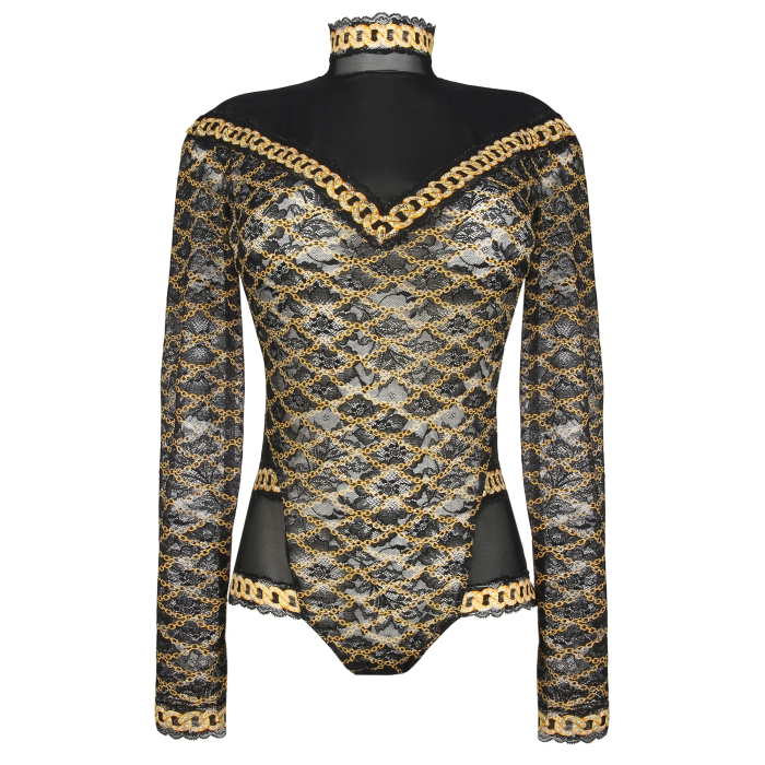 Body με κομψή εμφάνιση για πάρτι, από τούλι και ανακυκλωμένη δαντέλα με στάμπα αλυσίδας. Αυτό το στυλ έχει μακριά μανίκια, ψηλή λαιμόκοψη και σέξι πλάτη στολισμένη με δαντέλα. Με λεπτή επένδυση στα πόδια για αόρατη εφαρμογή.