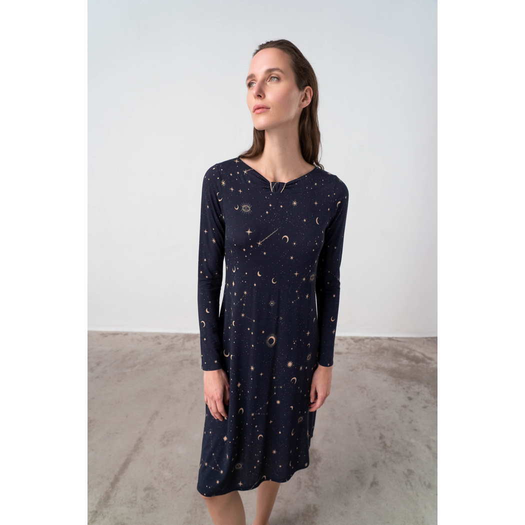 Νυχτικό με διακοσμημένη λαιμόκοψη, σε άνετη γραμμή. Ένα όμορφο εμπριμέ σχέδιο για εσάς που τολμάτε να ονειρεύεστε όλες τις ώρες της ημέρας.