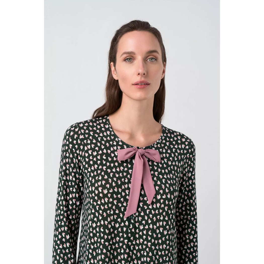 Εμπριμέ νυχτικό με μακρύ μανίκι, στρογγυλή λαιμόκοψη και μεγάλο διακοσμητικό φιόγκο. Απαλό ύφασμα, με μοντέρνα και χαλαρή διάθεση για όλη την ημέρα.
