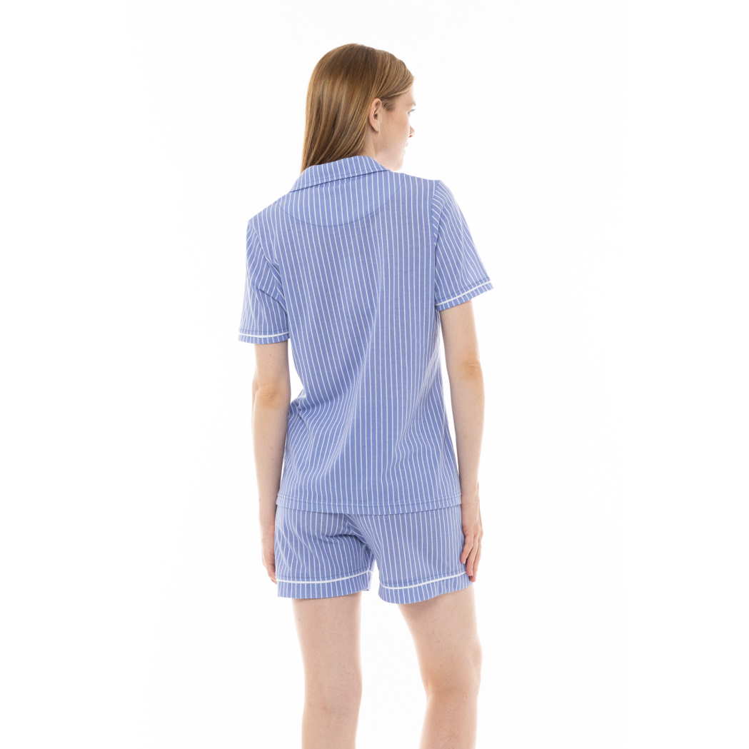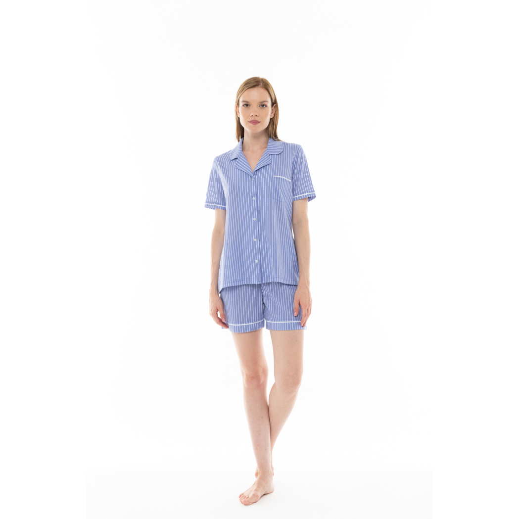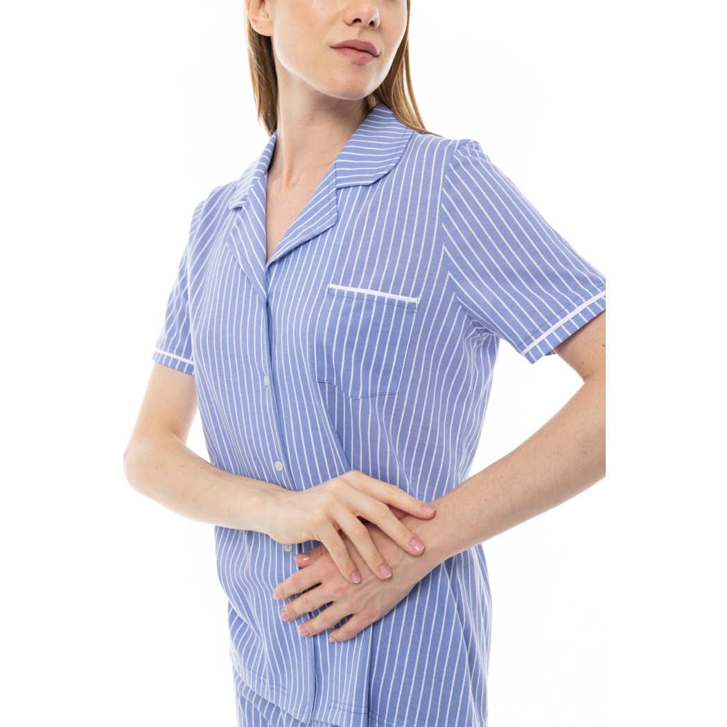 Γυναικεία πυζάμα κοντομάνικη με κουμπιά και βερμούδα βαμβακερή 100% μπλε με λευκή ρίγα.