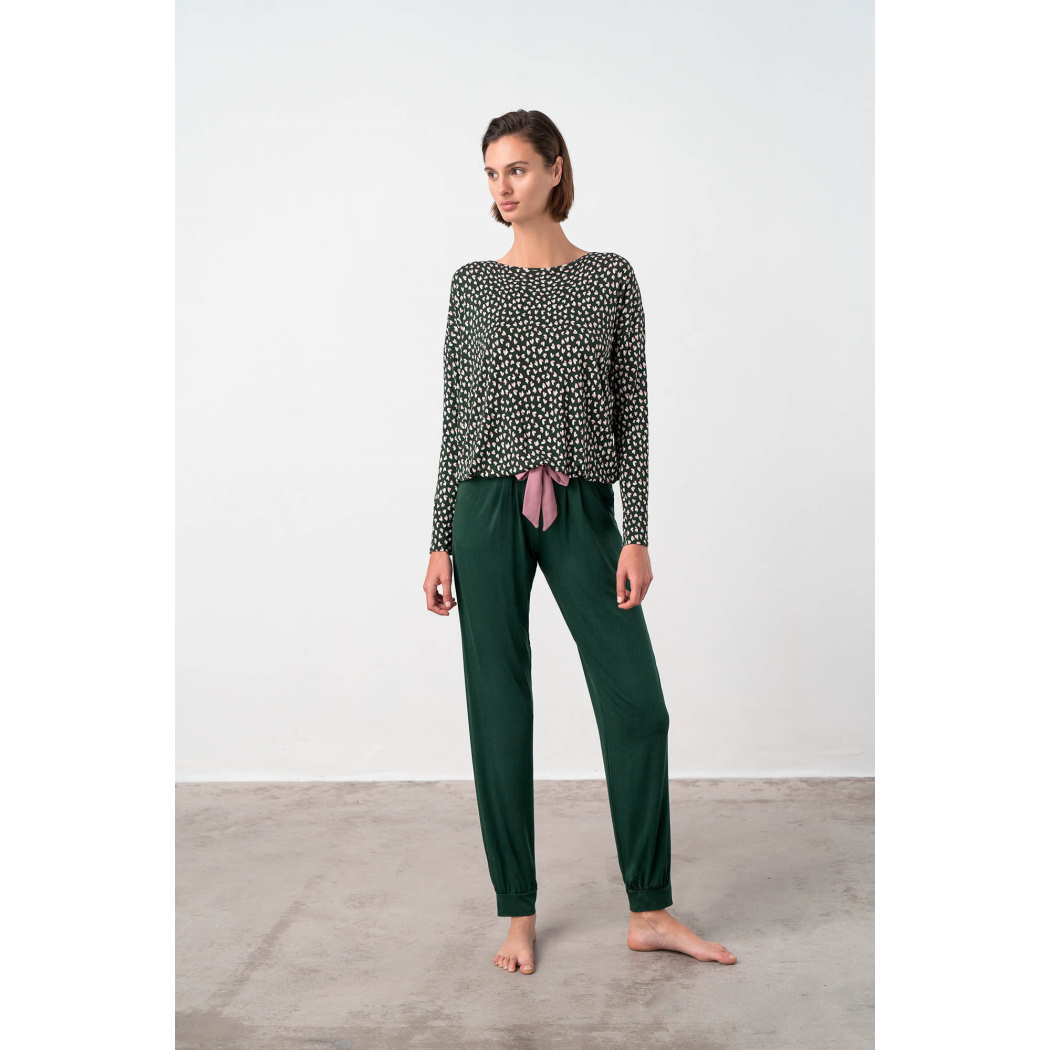 Γυναικεία πυτζάμα με ανοιχτή λαιμόκοψη και άνετο παντελόνι με διακοσμητικό φιόγκο. Απαλό ύφασμα, με μοντέρνα και χαλαρή διάθεση για όλη την ημέρα.