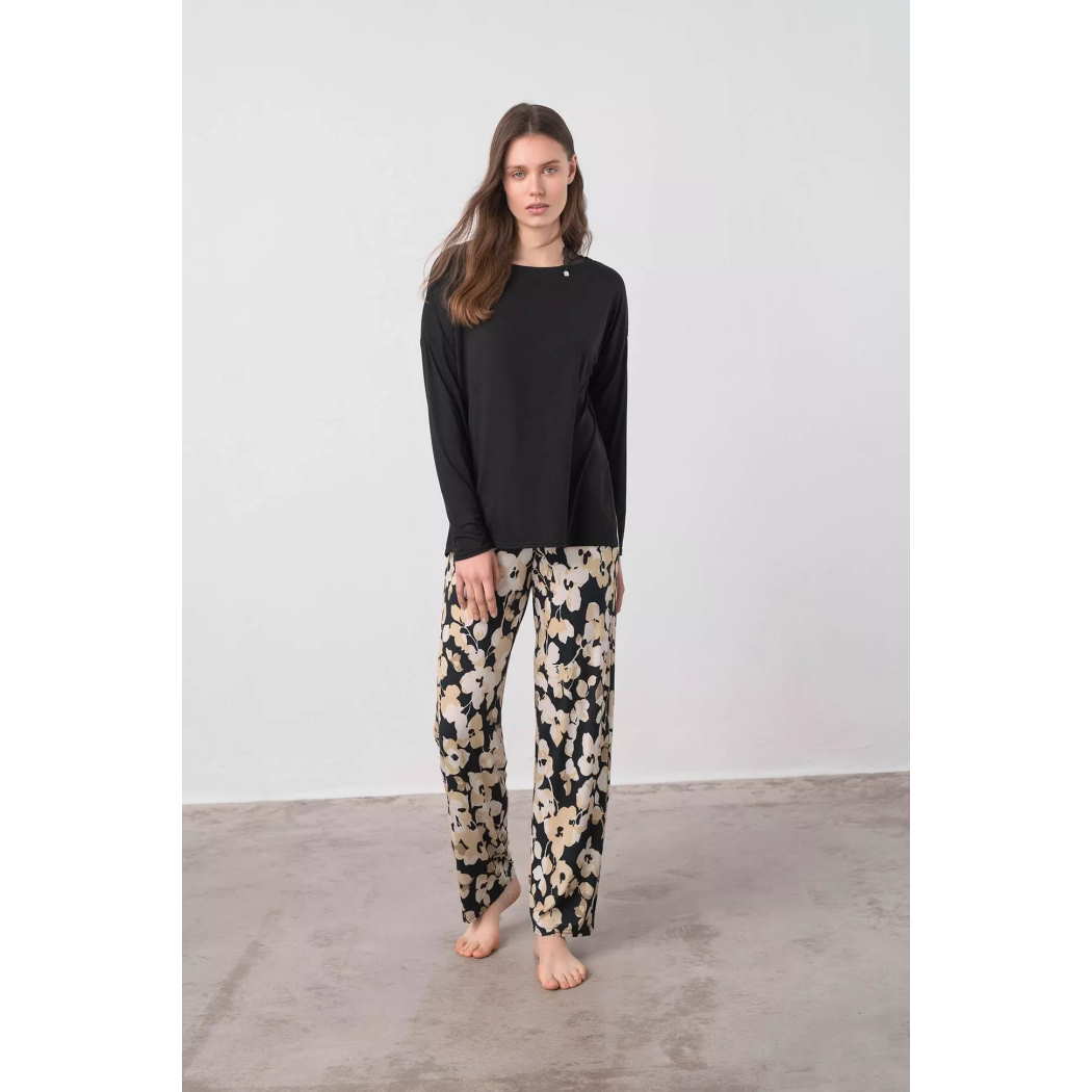 Γυναικεία πυτζάμα με φλοράλ παντελόνι και μονόχρωμη μπλούζα. Η ανάλαφρη εφαρμογή και το απαλό ύφασμα θα σας δώσουν την άνεση και τη κομψότητα που σας αξίζει.