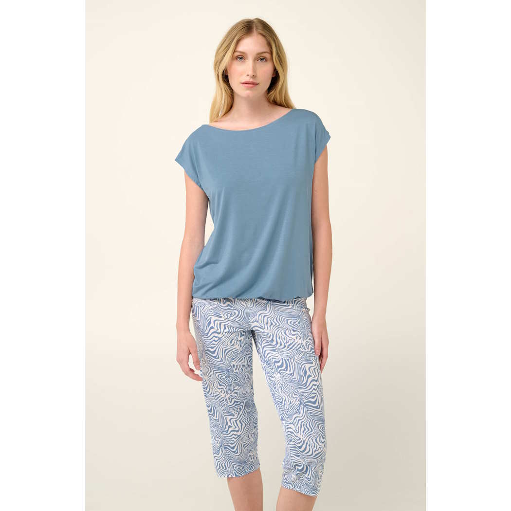 Χαλαρώστε με στυλ επιλέγοντας ένα σετ καλοκαιρινές γυναικείες πυτζάμες. Το σετ αποτελείται από κάπρι παντελόνι σε μοτίβο ζέβρας και μονόχρωμη γαλάζια μπλούζα με κοντό μανίκι και φαρδιά λαιμόκοψη. Κατασκευασμένο από ελαφρύ micromodal που χαρίζει μεταξένια αίσθηση στο δέρμα και επιτρέπει στο σώμα να αναπνέει θα σας βοηθήσει να απολαύσετε ένα ήρεμο πρωινό ή το βραδινό σας ύπνο.