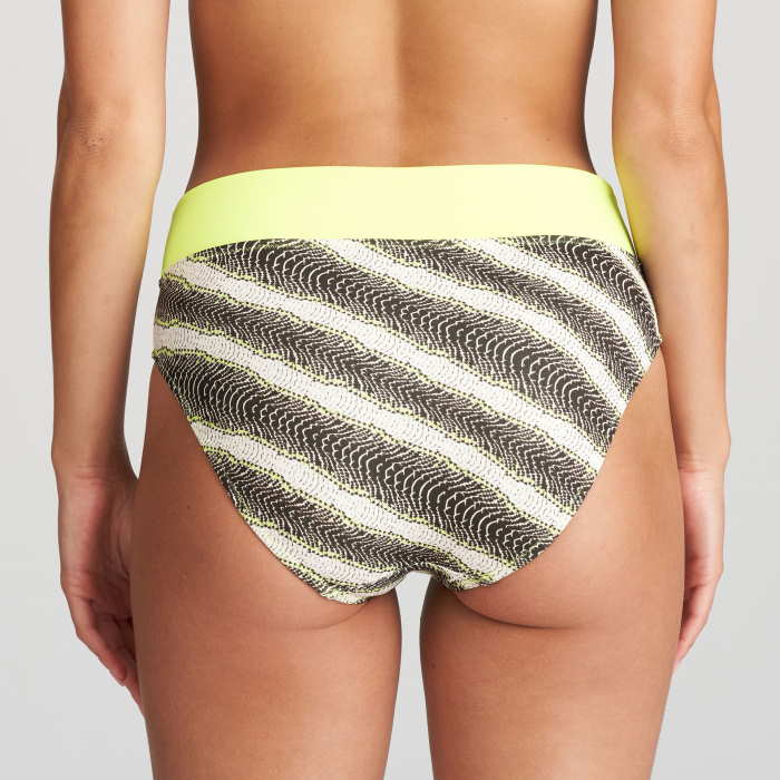 Αυτά τα ψηλόμεσα μπικίνι σαγηνεύουν με το μοντέρνο print και τις νέον λεπτομέρειες. Μπορείτε να διπλώσετε εύκολα την άκρη: πρακτικό για ηλιοθεραπεία! Παράγεται με 55% ανακυκλωμένα νήματα.