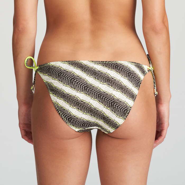 Επιπόλαιο πάτο μπικίνι με μοντέρνα ριγέ στάμπα και κίτρινες πινελιές νέον. Λεπτά δεμένα λουριά σπαγγέτι κοσμούν τους γοφούς. Παράγεται με 79% ανακυκλωμένα νήματα.