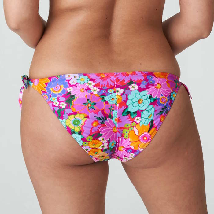 Παιχνιδιάρικο bikini slip tanga με πολύχρωμο φλοράλ στάμπα. Μπορείτε να δέσετε τα σχοινιά στα πλάγια, είτε στη μέση είτε πιο χαμηλά στους γοφούς.
