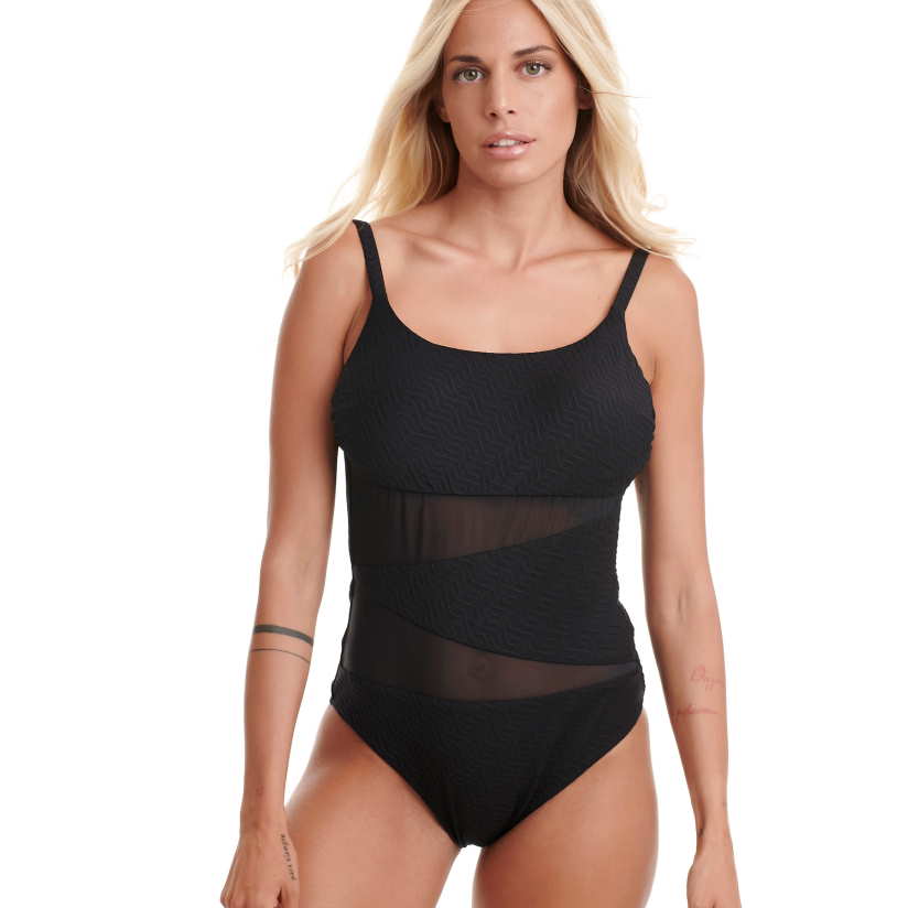 Μαγιό ολόσωμο, με προσθαφαίρεση ενίσχυσης και διαφάνειες. Άνετη γραμμή καλύπτει Cup C-F. (Σύνθεση: 82% Πολυαμίδη, 18% Ελαστάνη)