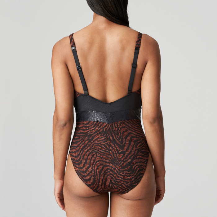Κομψό μαγιό που συνδυάζει τρία διαφορετικά animal prints με πρωτότυπο τρόπο. Τα τριγωνικά κύπελλα κόβονται πολύ βαθιά, όπως και η πλάτη. Πολύ μοντέρνο και σαγηνευτικό!
